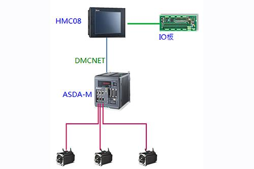 通過(guò)臺(tái)達(dá)人機(jī)控制器HMC系列為控制核心,可輕松在現(xiàn)場(chǎng)修改車床上下料程序,不需要更改底層程序代碼,從而使其臨場(chǎng)操作更加便捷靈活。此外,此類工件的加工對(duì)定位精度要求也很高,放置工件的允許精度最多不能超過(guò)10絲,如果誤差過(guò)大,會(huì)導(dǎo)致工件不能精確放到車床的卡盤(pán)里面。因此,臺(tái)達(dá)解決方案采用三機(jī)一體運(yùn)動(dòng)控制型交流伺服系統(tǒng)ASDA-M系列和高精度伺服馬達(dá),通過(guò)DMCNET高速運(yùn)動(dòng)總線組成網(wǎng)絡(luò),滿足客戶加工件的高精度加工需求。整體解決方案架構(gòu)如圖2。